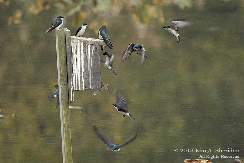 Tree Swallows are here in large numbers. They were busily quarreling over a number of nest boxes, even though it isn’t nesting season. We think there might be insect nests inside, and that’s what’s causing the chaos.