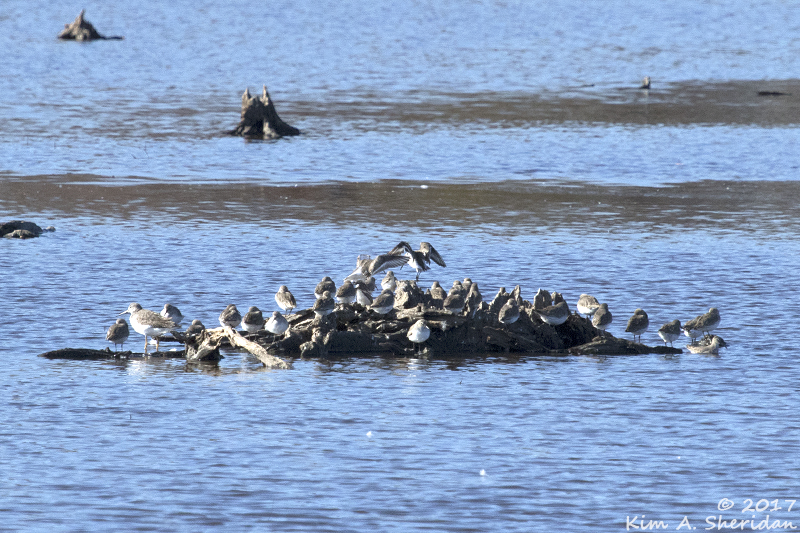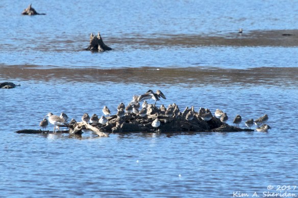 So do Dunlin, small shorebirds present in large numbers at Bombay Hook, wearing their drab winter plumage, and accompanied by a lone Yellowlegs. Not much to look at perched on a stump.