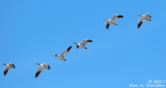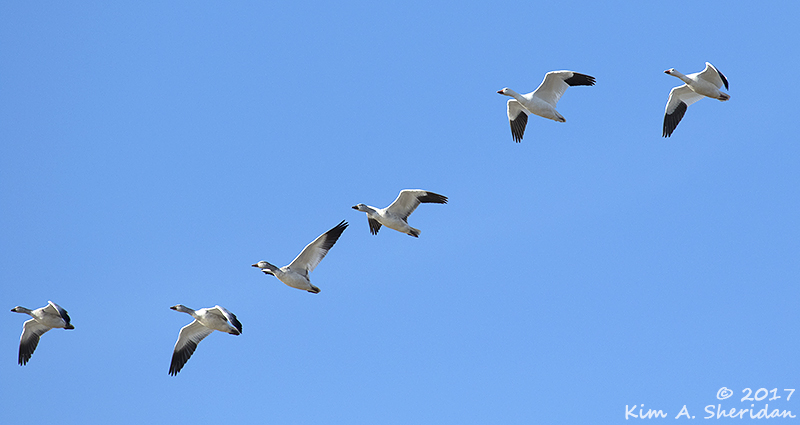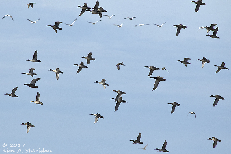 Ducks and geese filled the marshy pools. All was peaceful, if noisy, until the birds took off. Large flocks of Northern Pintails and Mallards and – oh look! Snow Geese! They flew this way and that, crisscrossing in a confused tangle of birds.