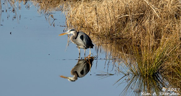 Serenity reigned a little further down the road as a Great Blue Heron admired his reflection.