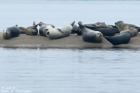 On the beach, we rest with our heads and hind flippers raised, sometimes curled into an exaggerated “banana pose.” Note the variation in coat color, from light to dark, and the spots and rings that mottle our skin.