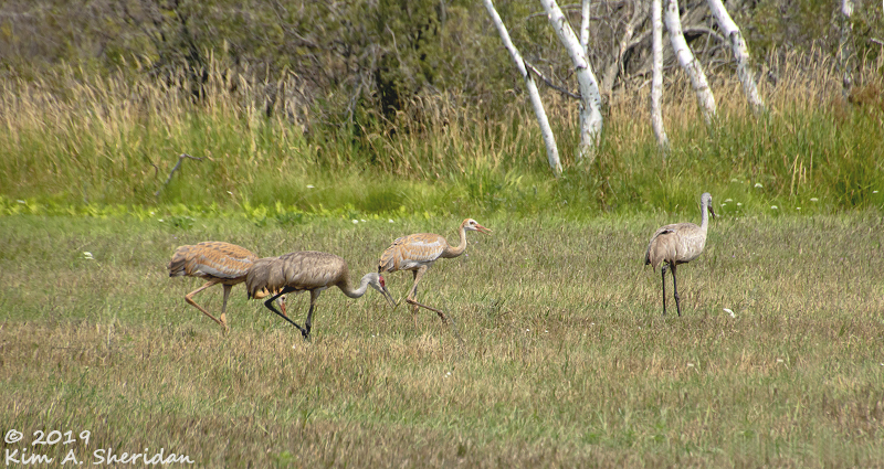 Adult Sandhill Crane in front, juvenile to the rear, both busily feeding. Meadows like this offer a good variety of insects. Cranes also eat snails, frogs, lizards and snakes, berries and seeds and even small rodents.