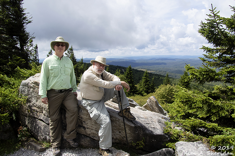Back on the trail, we soon came upon an interesting rock perfect for the official “Photo of the Day.” Robb and Don, trees, mountains and clouds.