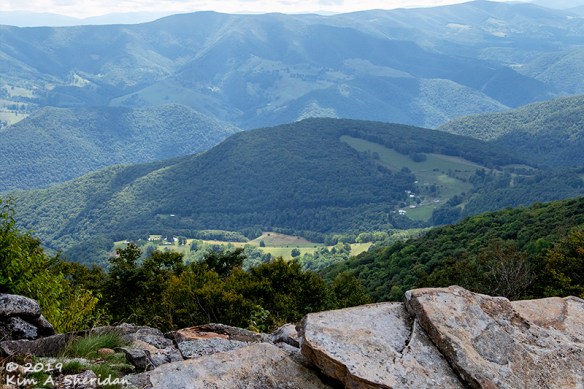 On the far side of the loop, we came to a viewing platform perched over a steep drop. The land dropped off much more sharply on this side of the Allegheny Front. Looking southeast, we could see meadows and pastures in the foreground. Behind that, a river, another knob and then more mountain ridges.