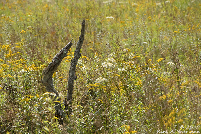 Here and there, marvelously twisted old snags poked above the wildflowers and grasses. We saw a kingbird perched on one, silhouetted against the bright blue sky. Alas, he was too fast for my camera. Old dead trees make wonderful hotels, with cozy cavities for nesting and an all-you-can-eat buffet of bugs and grubs open round the clock.