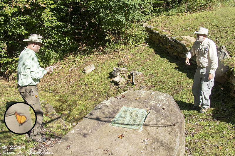 Historic: the Fairfax Stone, where in imitation of George Washington, Robb and Don pitched a quarter back and forth across the head spring of the Potomac River, every toss of the coin closely mimicked by a curious Monarch butterfly (inset)