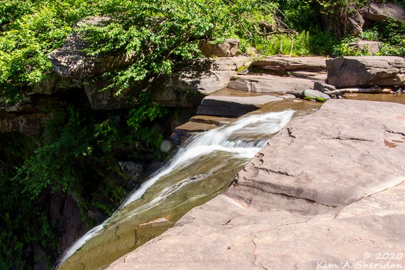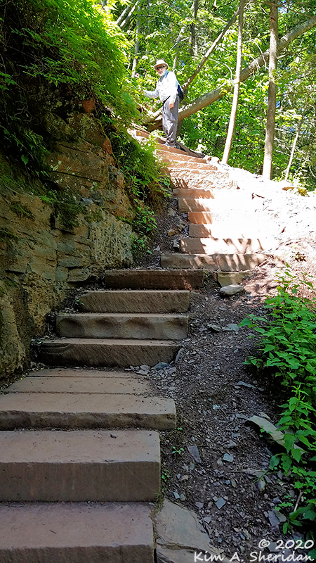 Starting at the top meant we walked downhill along a rocky but easy trail through the mixed hardwood forest. As the trail steepened, we came to a series of sandstone steps. Nice. (Don’t even think about the walk back up.)