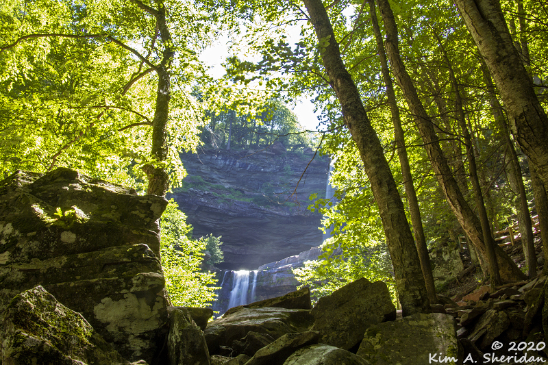 Uh oh, this was going to be a bigger photographic challenge than I anticipated! Dark, dark woods and bright sunlight coming straight at the camera and leaving the falls in shadow – way too much contrast for the camera to capture. Getting the tripod steady on the rocks took constant tinkering. My high expectations were falling as dramatically as the waterfall.