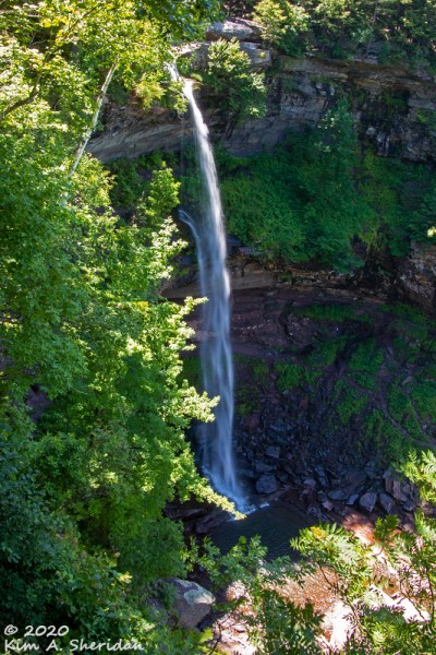 Climbing up the trail. A glimpse of the 80′ tall lower falls and the pool below.
