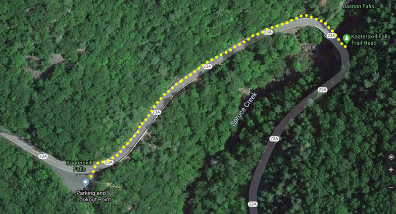 The traditional route to Kaaterskill Falls is an easy ¾-mile hike uphill. Well, easy if you risk life and limb… To get to the trailhead, a hiker must walk ¼-mile along Route 23A into the heart of a hairpin turn. There’s no shoulder, no space outside the guardrail, nowhere to go if a vehicle approaches.