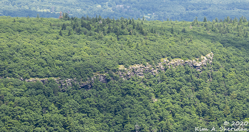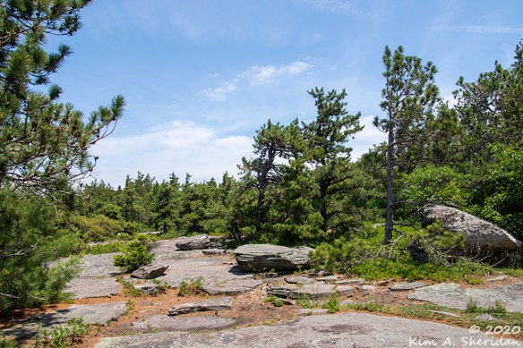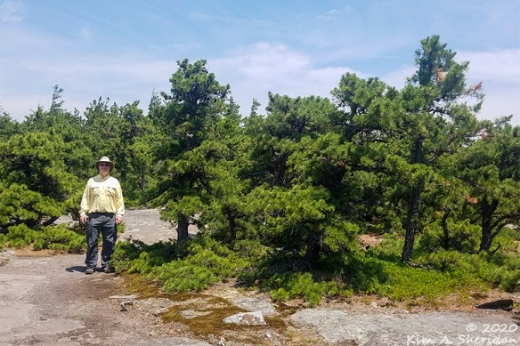 In the other direction was a forest of stunted trees. Yup, these are pitch pines, the familiar tree from our beloved Jersey Pine Barrens. Anywhere we find barren soil or bare rock, we find pitch pines, reindeer lichen and heath plants like blueberries and laurels. Fire-adapted plants do well in the dry climate of the escarpment.