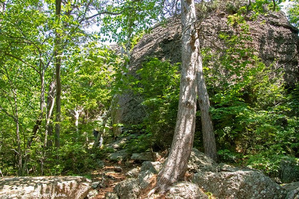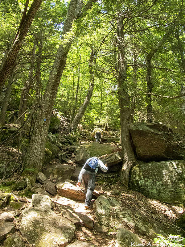 After exploring Artists Rock and enjoying the view of the Hudson Valley, we retreated into the shaded woods along the Escarpment Trail. Artists Rock was not the end of the adventure; there was more to see, and so we moseyed on up the path. Pretty soon we came upon another big rock outcropping in the middle of the trail. No way around it but up.