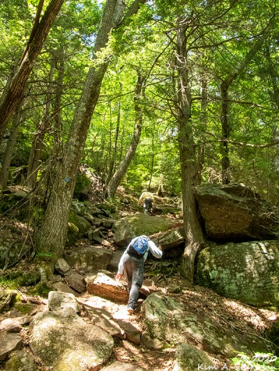 The trail got rocky and steep again, with plenty of rocky steps to climb. Don, with Robb higher up, for scale.