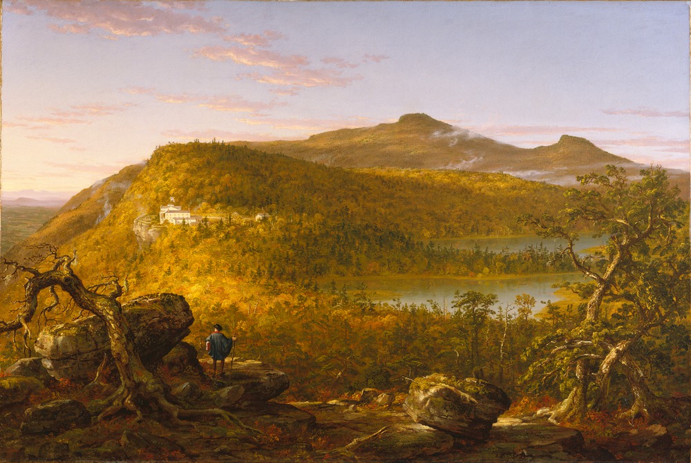 Like so. This is Thomas Coles’ A View of the Two Lakes and Mountain House, Catskill Mountains, Morning. It was painted in 1844, twenty years after Mountain House was built. Cole stayed at Mountain House, and hiked up here to Sunset Rock to sketch studies for this painting. Alas, Mountain House is no more.
