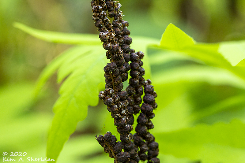 Sensitive Fern sori turn dark brown, persist throughout the winter and release their spores in the spring.