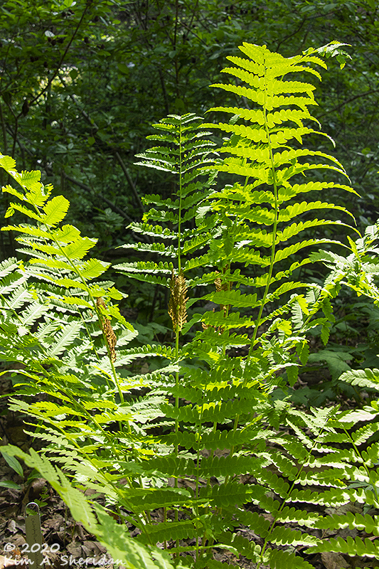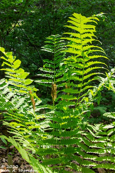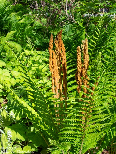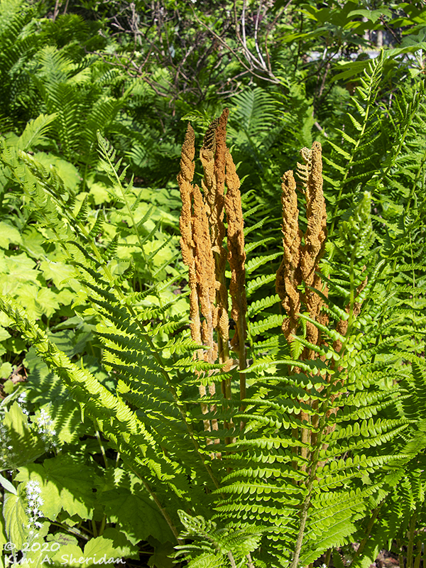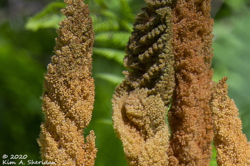 Cinnamon Ferns are members of an ancient, primitive fern family called Osmunda. Here’s the exception to the rule: Osmunda ferns don’t have sori! Instead, fertile fronds bear large naked sporangia filled with spores.