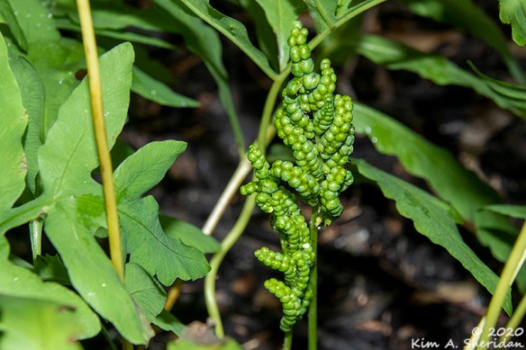 Sori may also be carried on a separate fertile stalk that looks different than the sterile frond. Sensitive Ferns are a common example of this. The small hardened pinnules roll inwards to cover the sori. They look like little beads on a stick.