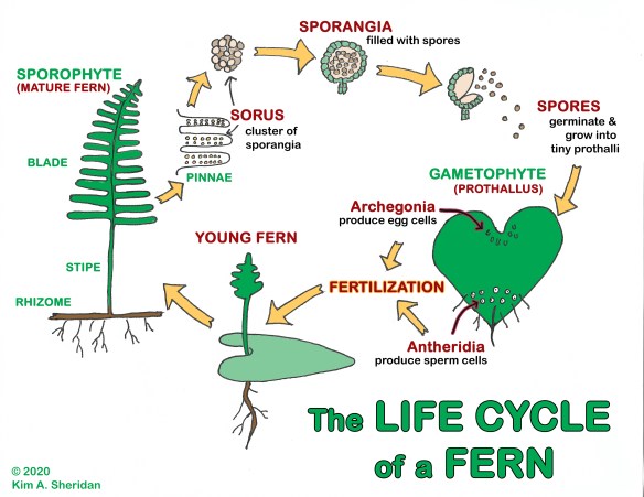 Let’s get something straight right off the top. The old wives’ tales are wrong: ferns do NOT have seeds. They have spores, something different altogether, and sexual reproduction by spores is a complicated two-stage process.