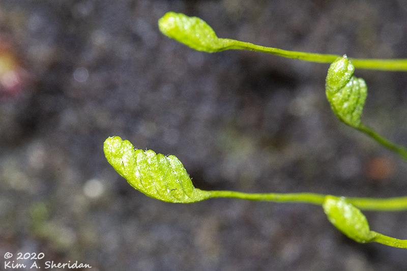 These are the comb-like fertile fronds. Curly-grass fern lives in bogs and on sphagnum hummocks. Photographing these truly diminutive plants where they grew on the side of a river bank was a real balancing act that nearly ended in wet embarrassment. We haven’t seen this fern since, no matter how hard we’ve looked.