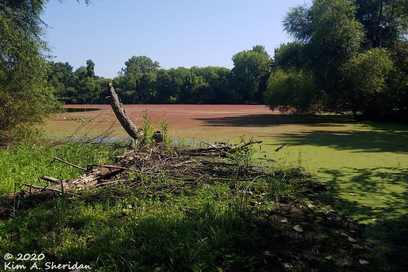 In the shade, Mosquito Fern is green. In sun, it changes color to tint the pond’s surface red. We don’t know why Mosquito Fern appears on this pond at the Refuge in some summers, but not others. Ah, the mysteries of ferns.