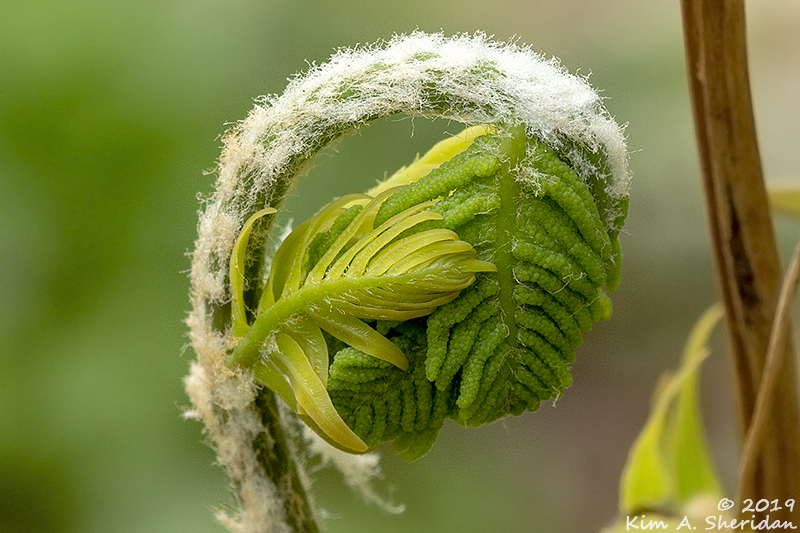 Just beginning to unfurl, Maidenhair already shows its unusual stem structure.