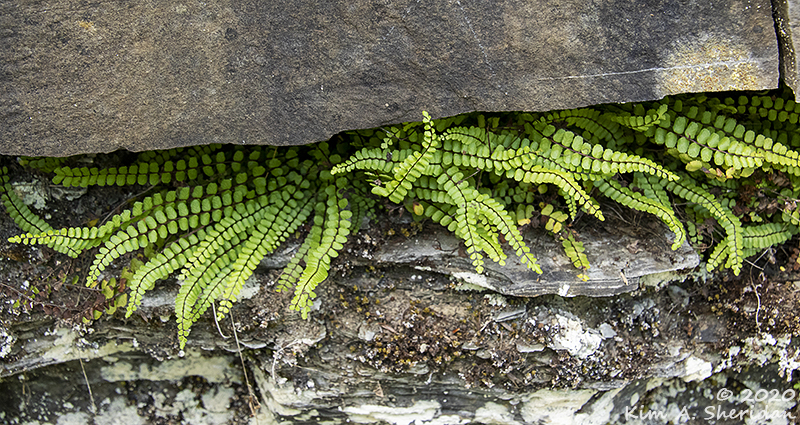 Now the trail begins to climb among boulders and rock walls. What might we find here? An octopus reaching its tentacles out from a rock crevice? No, it’s Maidenhair Spleenwort, a small fern that loves these rocky abodes. Its dark rachis and the shape of its pinnules resemble those of Maidenhair Fern, but the two are not related.