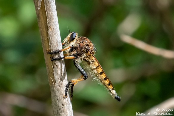 Eyes averted, late-arrivers scurry past this robber fly. His name alone – Red-footed Cannibalfly – tells you all you need to know of his reputation.