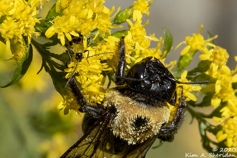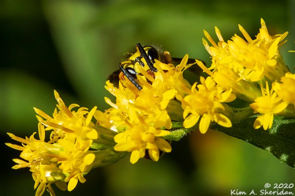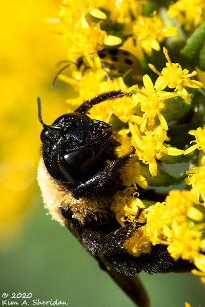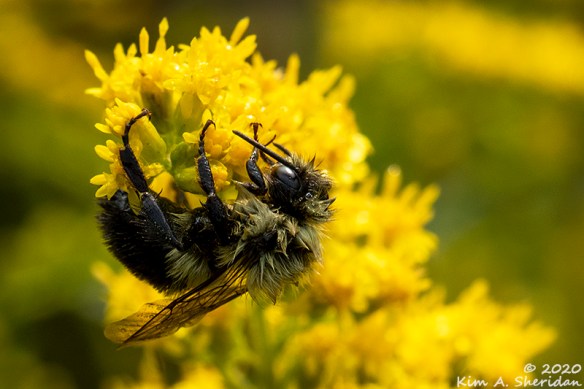 FUN FACT: Yes, bees sleep! Their eyes don’t close, since they don’t have eyelids. But their antennas stop moving, they curl their abdomens in and off to sleep they go. They may even dream! Scientists studying honey bees have found they use several hours of sleep each day to consolidate their experiences into long-term memory, much like humans do. These days I regularly find four or five motionless bees snoozing away in my goldenrod in the early morning.