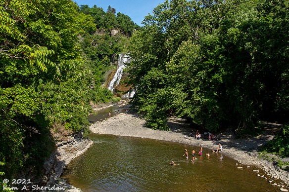 Shortly after I arrived, they showed me why. We took a little walking tour of the Fall Creek Gorge, smack dab in the middle of Cornell University. First stop, Ithaca Falls. Like any waterway on a hot July day, Fall Creek attracted its share of perspiring people looking to cool off.