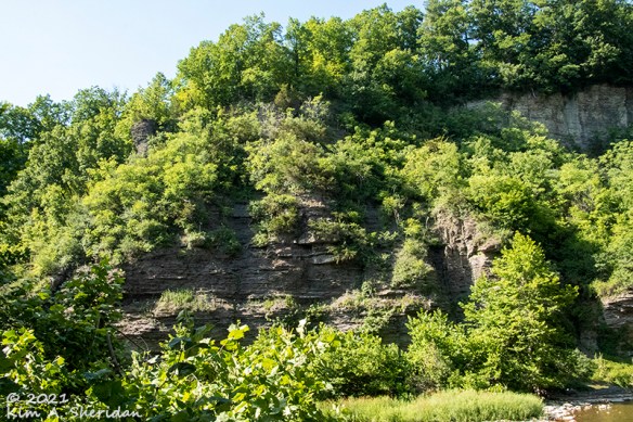For now, we’ll just say that the valleys in which the Finger Lakes lie are very steep. Fall Creek drops over 400’ in a little more than a half-mile. Ithaca Falls is at the bottom of that steep run. Immediately I noticed how straight the layers of rock were, quite different than the sharply tilted layers at home. This caught my eye again and again.