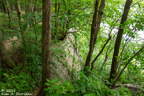 At last, I came to the edge of the world, and peaked over gingerly. I was standing on a precipice of strange-looking tan rocks. The Lake Cliffs are composed of Tully limestone, a rock I don’t run into very frequently at this scale. The limestone supports a diverse and specialized forest. Locally rare plants hide among oak, hickory, sugar maple and hop hornbeam trees.
