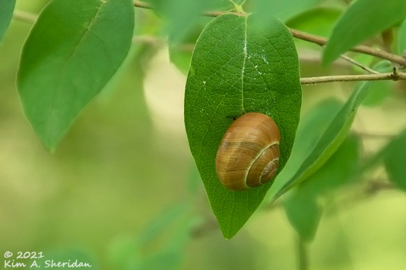Moving on…The trails I wandered next went through thick shrub habitat that was once farmland. Little snails hung out, trying to stay cool.