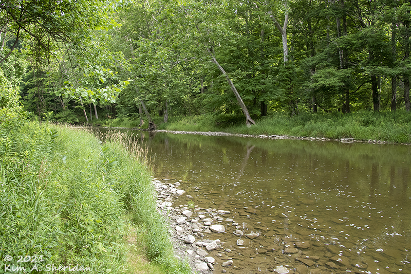 Looking downstream. Notice how the left bank (where we were walking) has hemlocks and the right bank has deciduous trees.