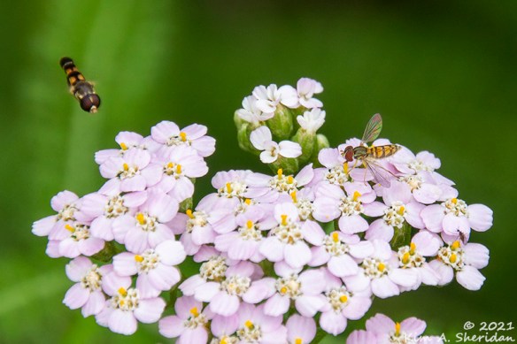 Not everything hovering around the flowers is a bee. Here we have two Hover Flies: a Common Compost Fly (top left) and one of my favorites, a Margined Calligrapher Fly (top right.)