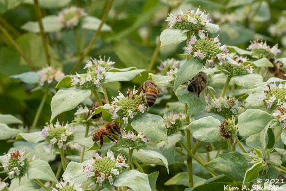 European Honey Bees on mountain mint, a plant that attracts many species of insects. Honey bees were introduced to North America by the first settlers in the 1600s, and are now commercially kept by bee keepers for their honey. They also account for 80% of crop pollination in the country.