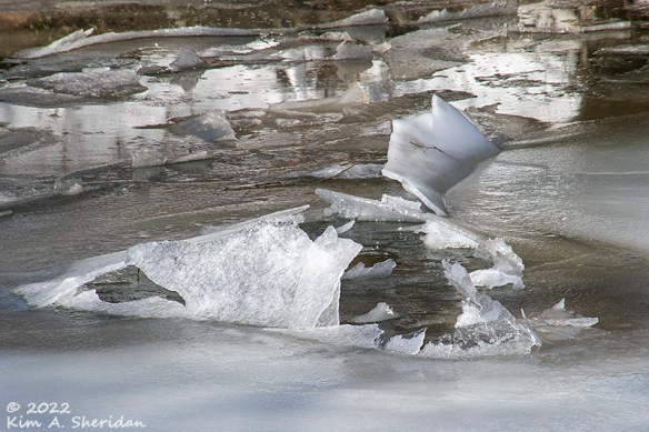 Underneath the ice, the water is always moving, up and down with the tides and current, making for some interesting works of ice art.
