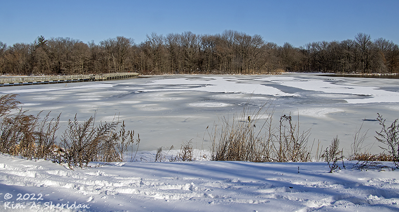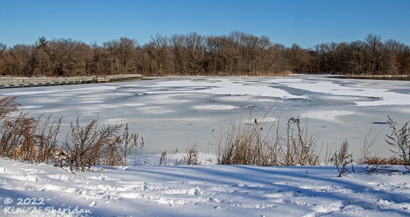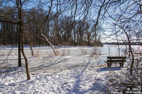 A favorite spot by the Little Boardwalk. You can tell how high the impoundment’s been lately by where the frozen water meets the snowy land. Almost to the foot of the bench.