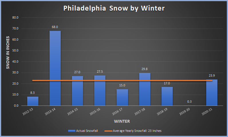 My memories of recent winters as snowless are colored by the winter of 2019-2020. We got a grand whopping 0.3” of snow in Philadelphia that year!