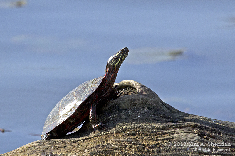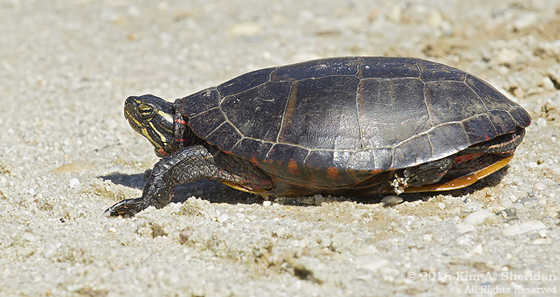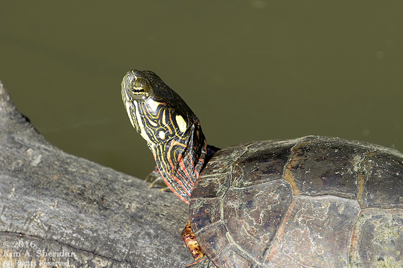 This Painted Turtle shows some uniquely beautiful markings as he strains his neck going around the curve.