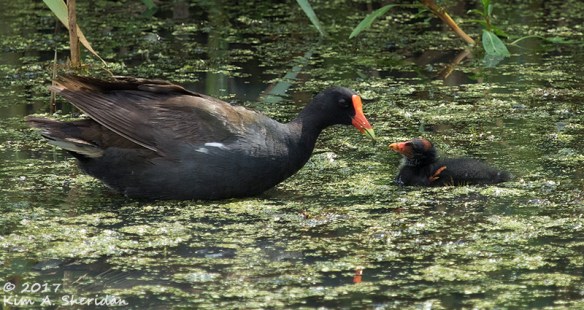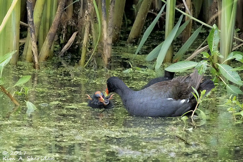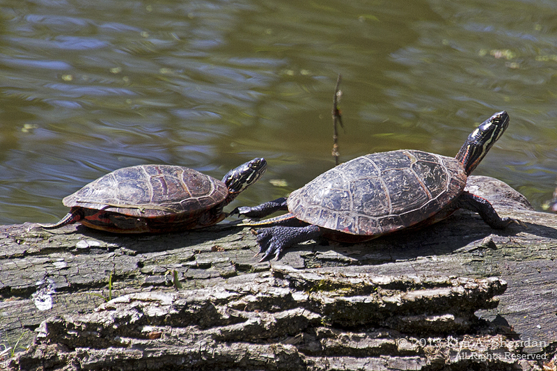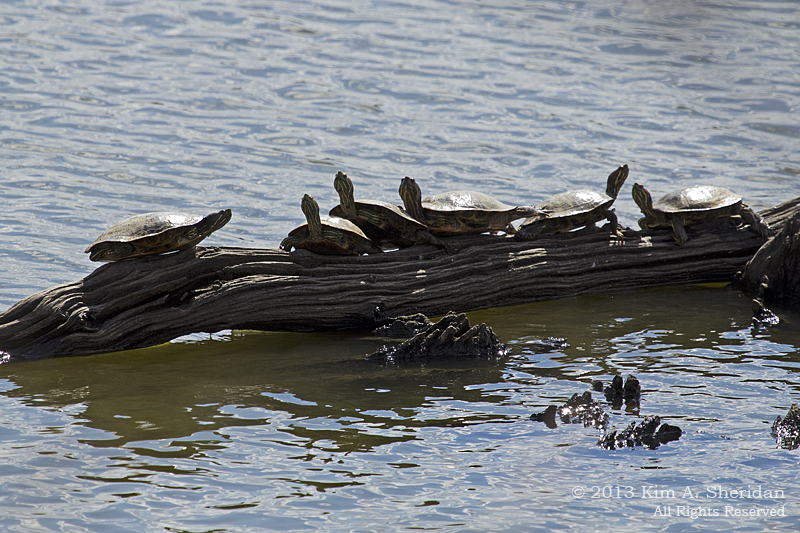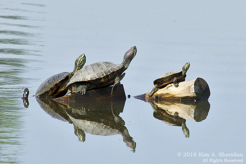 Red-eared Sliders look quite similar to Painted Turtles, and the two species frequently sun together. The red stripe on the side of the Slider’s head gives it away. They don’t belong here; they are native to the Mississippi River Basin. But they are popular pets, and frequently released into the wild, so that they have become established throughout the country. They often out-compete other turtles, the hallmark of an invasive species.