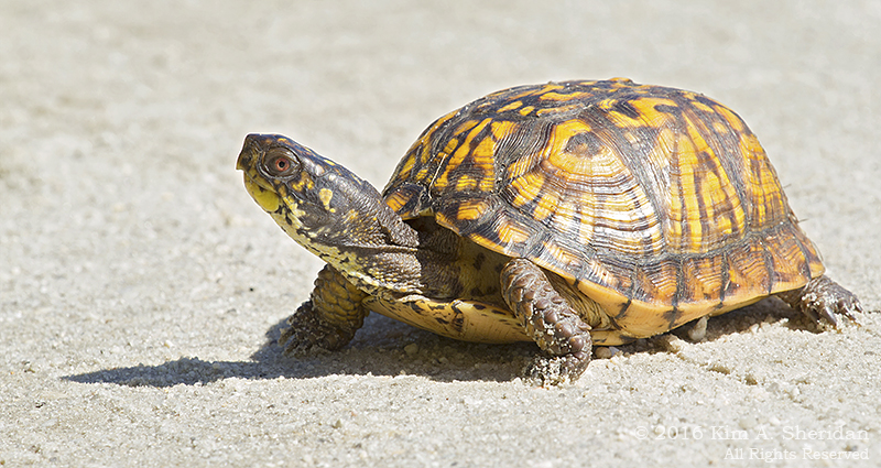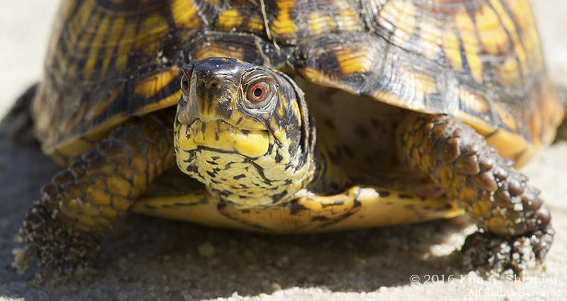 Here we go, fans! Coming into the first turn is an Eastern Box Turtle. Surprising to see him in the lead. Box Turtles are known to be particularly slow, which is saying something when you’re talking about turtles. Look at the domed carapace (upper shell) on this guy!