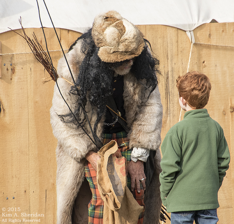 The legend of Der Belsnickel takes many forms. In Pennsylvania German regions it goes back to at least the early 1800s. The Belsnickel – in one version of the tale – was a grouchy-looking man dressed in ragged, dirty clothes and furs (“St. Nicholas in fur” is one translation of Belsnickel.) He wore ashes on his face or a mask, and carried a switch and a sack of treats. The Belsnickel appeared in houses in the weeks leading up to Christmas as a reminder to children to behave. He often asked the children to recite for him or sing a song. Then he would throw candy, fruit and nuts on the floor. A child who jumped forward too eagerly might get the wrong end of the switch. The good children would end up with a fistful of treats.