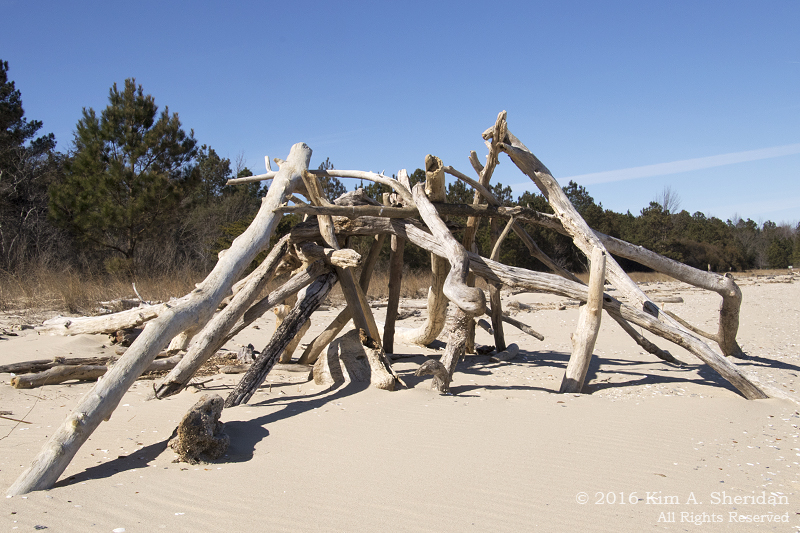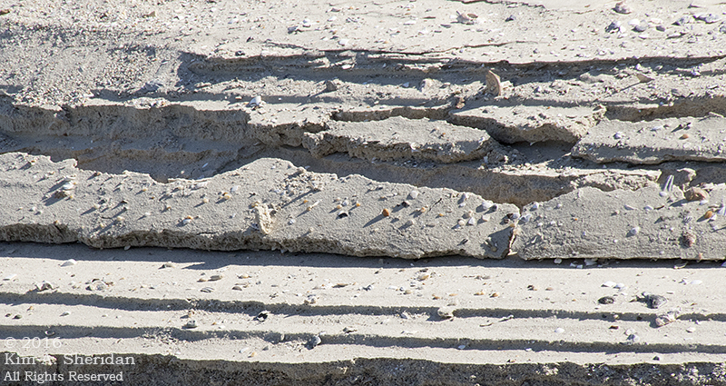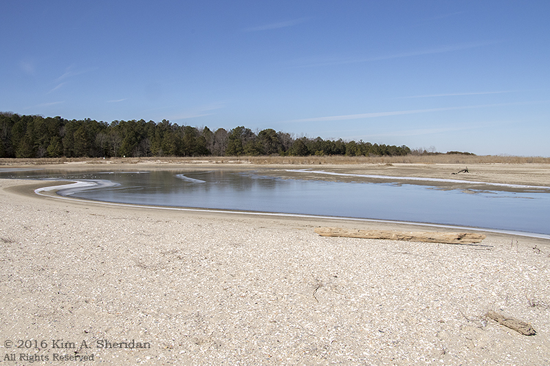 The next afternoon we went to the beach near a portion of the Calvert Cliffs, hoping to find fossils. The gatekeeper showed us some fossils he’d found recently, petrified wood and a shark’s tooth. He said he’d found them yards out in the water, where the Bay is very shallow. Oops! Mistake #1: we left our muck boots at home. With temperatures hovering around 22° and a stiff breeze, there was no way we were walking in the water.