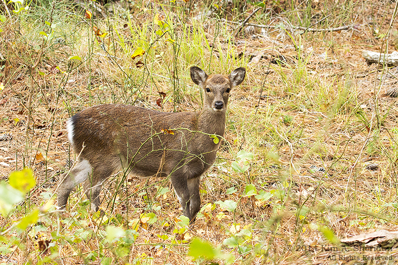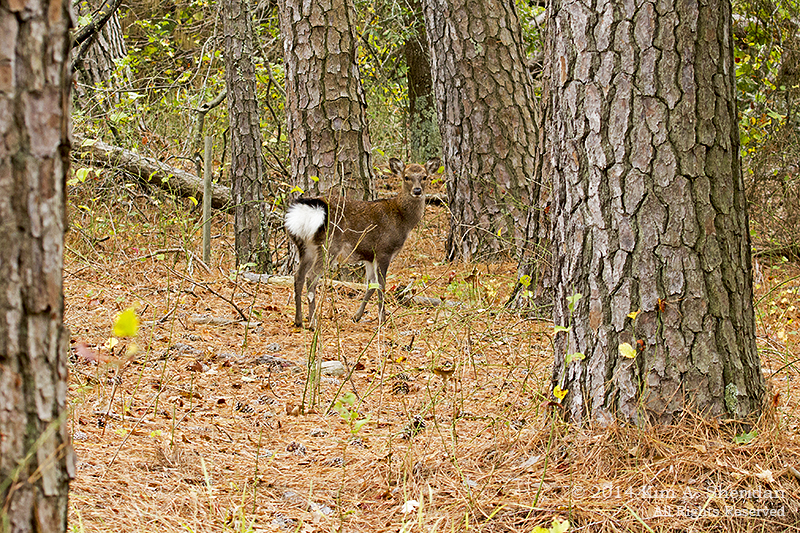 141019_Chincoteague NWR Woodland Trail_1204 aWe encountered several Sika Elk on a walk through the woods. They regarded us with much curiosity, coming closer to us to get a good look when we stood quietly. See the spots on the white rump? They remain throughout adulthood, unlike the native White-tails. This elk demonstrated an unusual way of bounding away that I can only describe, poorly, as a stiff-legged bounce. Watching it hop had us in stitches.