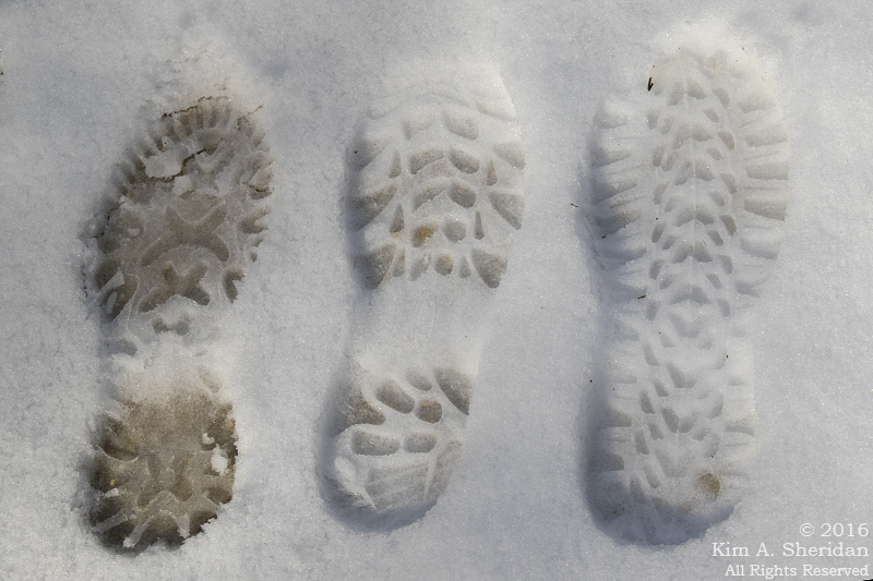 Our boot prints. From left to right: Kim, Robb, Don. The sizes are deceiving; my foot is smaller than the guys’. Really it is.