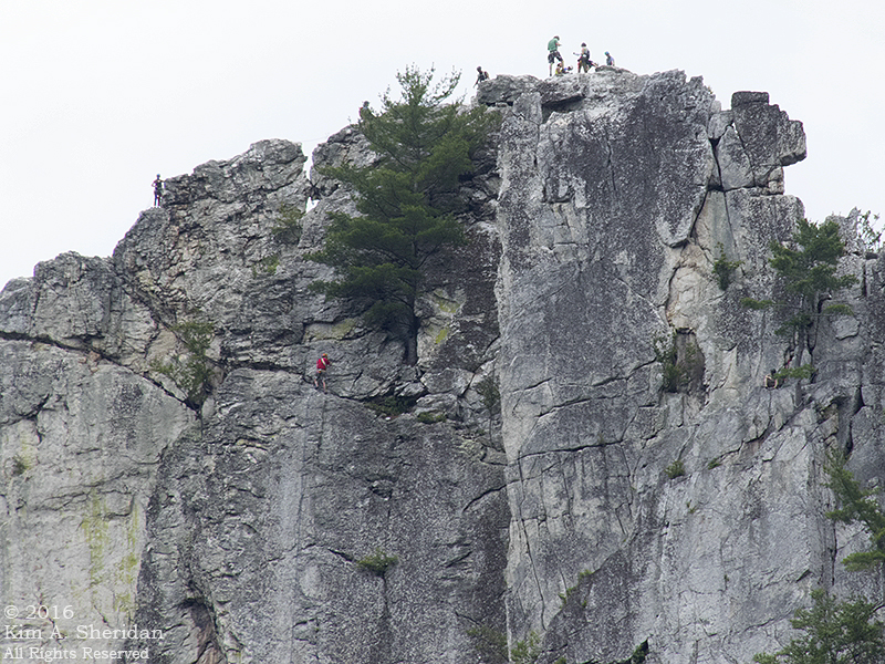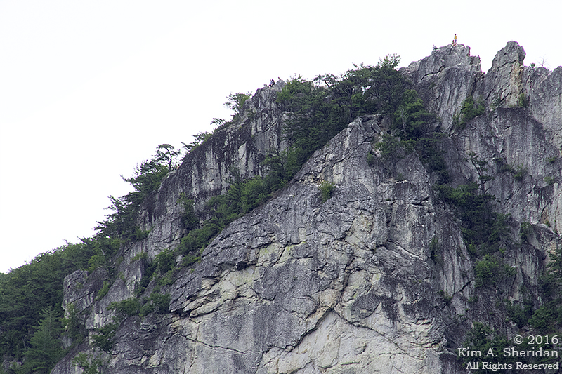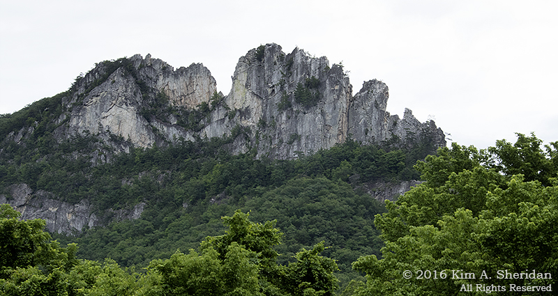 This is the South Peak of Seneca Rocks. Here we find the serious rock climbers doing the serious work of playing on cliff faces. How many climbers do you see? Seven (or more) on the top. Two on the face. Don’t see the second one? He’s at the right edge of the photo, resting in the shade of a tree. Maybe enjoying a good book.