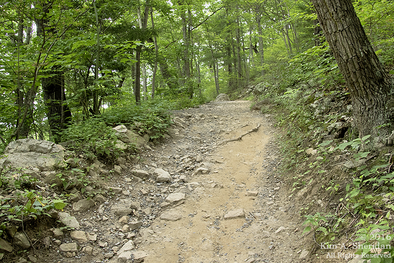 One of many switchbacks. This photo isn’t crooked either, the trees grow that way. Trees like striped maple, birch, beech and oak, and some pines near the summit. I tried to get the entire switchback in the photo, but couldn’t without falling off the mountain.
