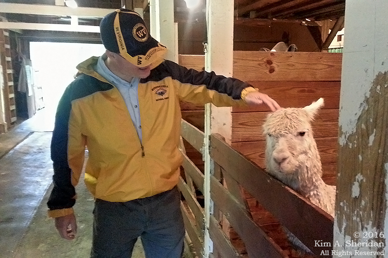 Robb and his new friend, Miss Moptop Alpaca. (cellphone image)