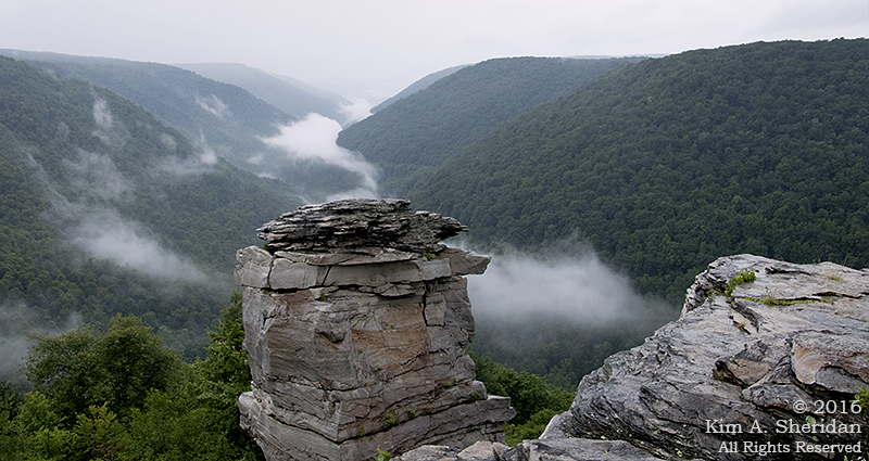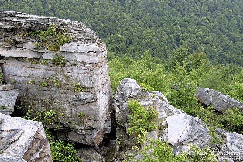 The trail ended at a rocky outcropping, a once-proud craggy castle clinging to a precipice overlooking the Blackwater River Gorge. A two-tiered observation deck awaited us there. Mostly we ignored it in favor of ducking through curtains of greenery to stony alcoves open to the leaden sky. The rock formations and the view drew my complete attention…