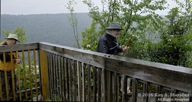 I want to go to the top, too! But just when I’m rejuvenated, Robb reappears, so we both head out onto the platform to enjoy the wonderful panorama. The pines on the right are Pinus pungens or Table Mountain pine, native to the Appalachian Mountains.